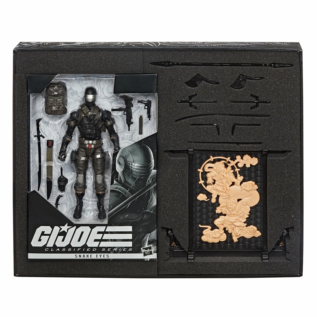 Includes: G.I. Joe Classified Series Snake Eyes action figure, 11 accessories, gear storage rack, and collectible print.
