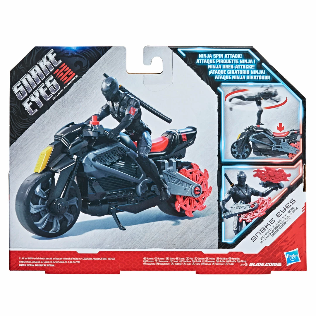 Kids can imagine racing full-throttle into ninja-spinning action with Snake Eyes! Enter a world of cutting-edge technology, traditional Ninjutsu weapons, breathtaking martial arts, and next-gen ninjas with the Snake Eyes: G.I. Joe Origins Snake Eyes with Stealth Cycle figure and vehicle! The Snake Eyes toy comes ready for action, with multiple points of articulation for poseability and character-inspired accessories!