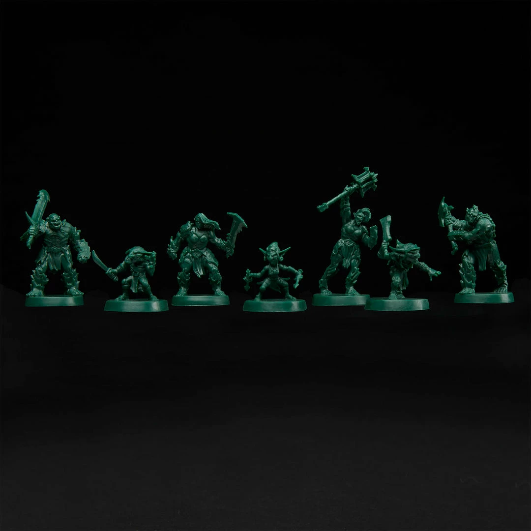 Includes gameboard, 31 monster miniatures, 4 hero miniatures, 15 furniture pieces, 10 skull pieces, 4 plastic rat pieces, 21 dungeon doors, 93 game cards, 4 turn-order cards, cardboard tiles, Quest Book, 4 character cards, Game Master’s screen, pad of character sheets, 6 white combat dice, 2 red dice, and rulebook.