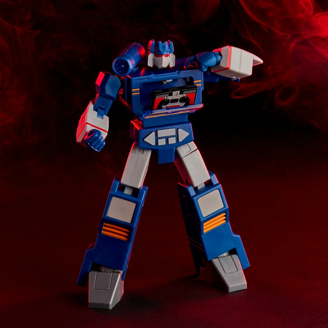The sly Decepticon communications officer, Soundwave, from The Transformers animated series features a shoulder-mounted cannon accessory, 2 alternate hands, a backpack accessory, and a Concussion Blaster accessory. Open Soundwave figure’s chest to reveal removable cassette tape accessory.
