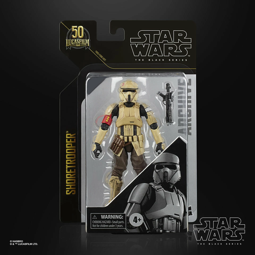Recall intense moments from the Star Wars Galaxy with this Star Wars The Black Series Archive Lucasfilm 50th anniversary 6-inch-scale Shoretrooper figure with blaster accessory, featuring premium deco across multiple points of articulation.