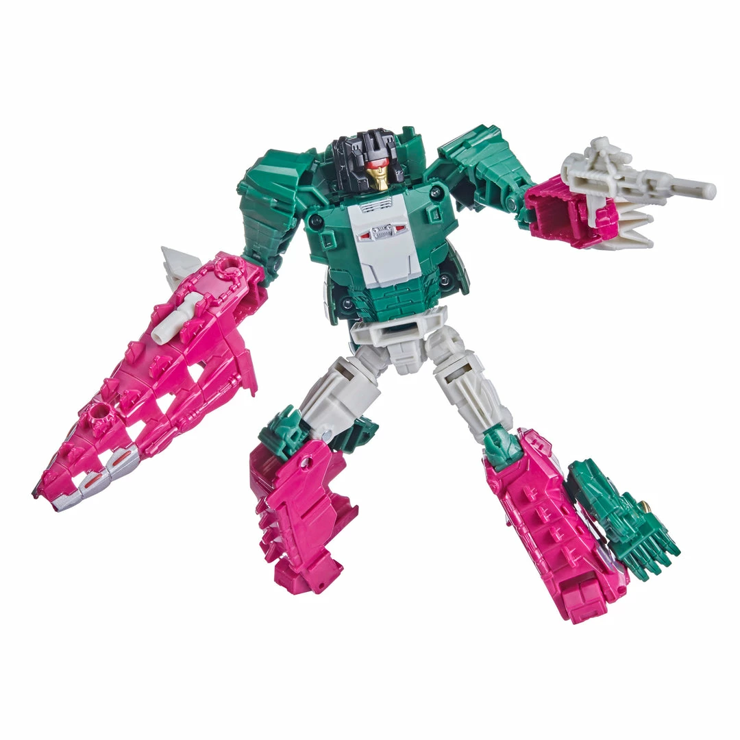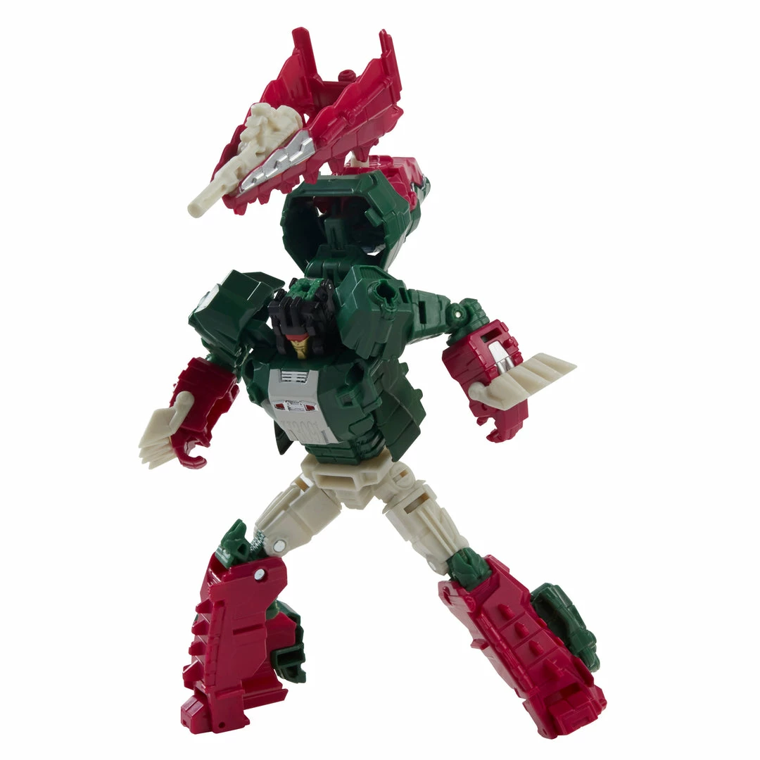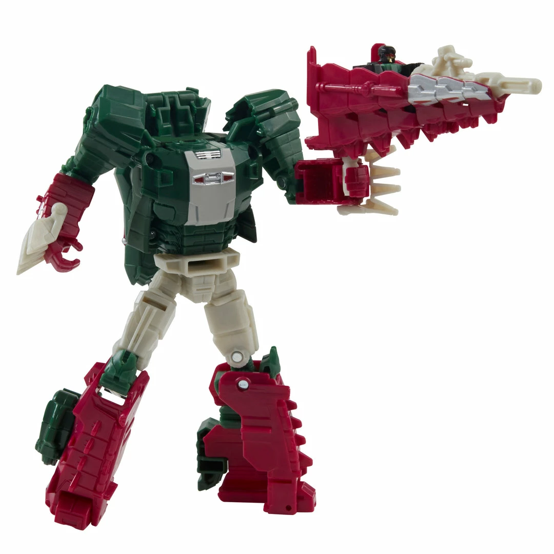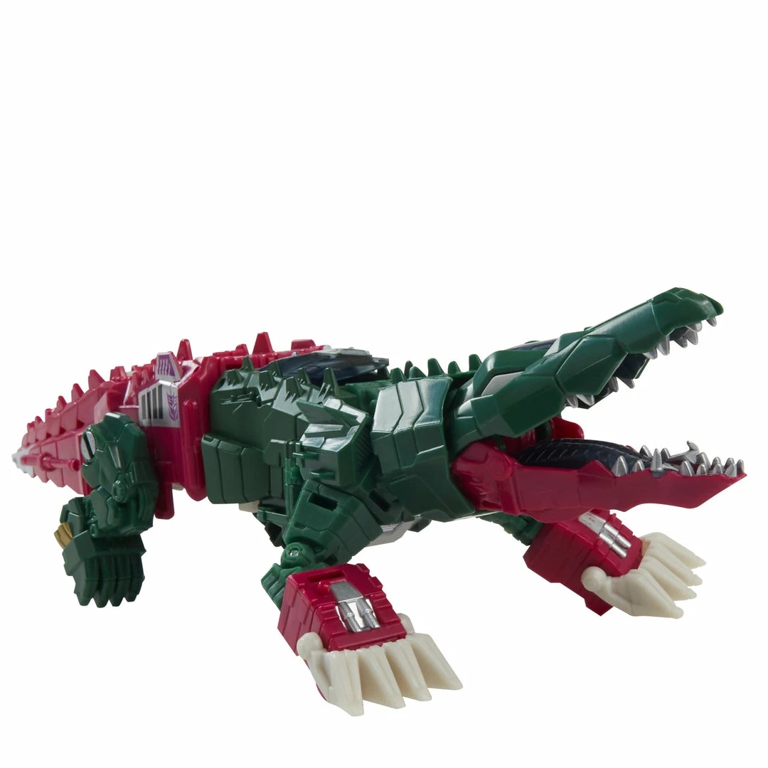 This Skullcruncher figure converts from robot to crocodile mode in 13 steps. Crocodile mode features articulated jaw. Skullcruncher figure’s head converts into Headmaster Trainer Grax figure. Comes with blaster and sword accessories.