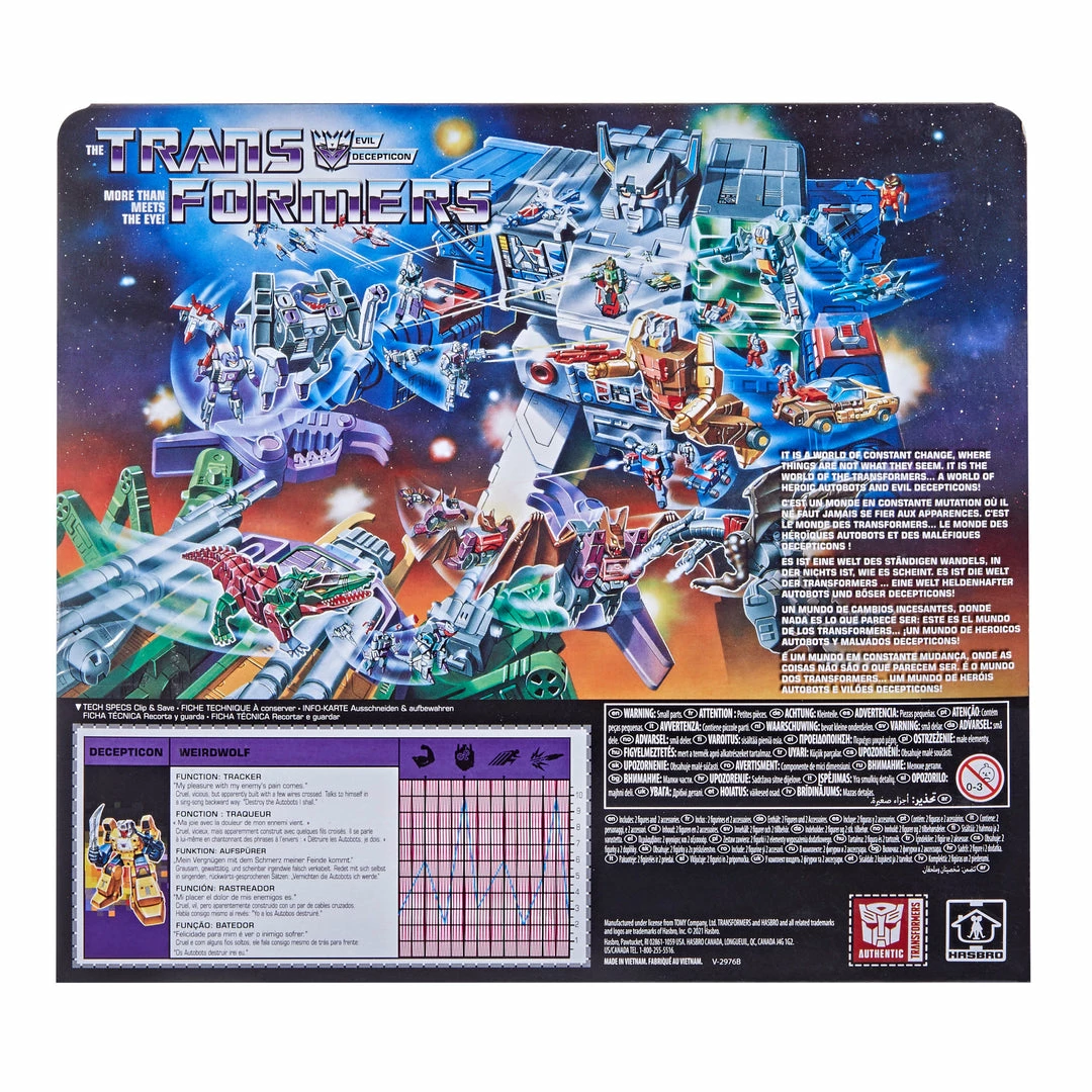 - Tech specs for Weirdwolf are included on the pack in the classic G1 style fans know and love. Look for other Retro Headmaster figures and compare figuresโ strength, speed, firepower, and more (each sold separately, subject to availability).