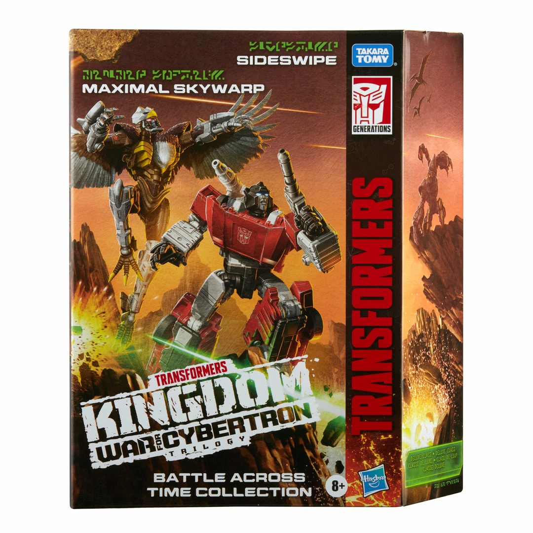 Includes Transformers Generations War for Cybertron: Kingdom Deluxe Class Sideswipe and Maximal Skywarp figures, 4 accessories, and instructions.
