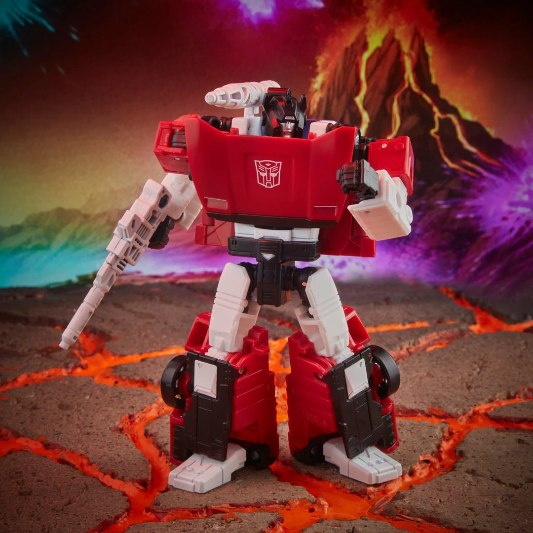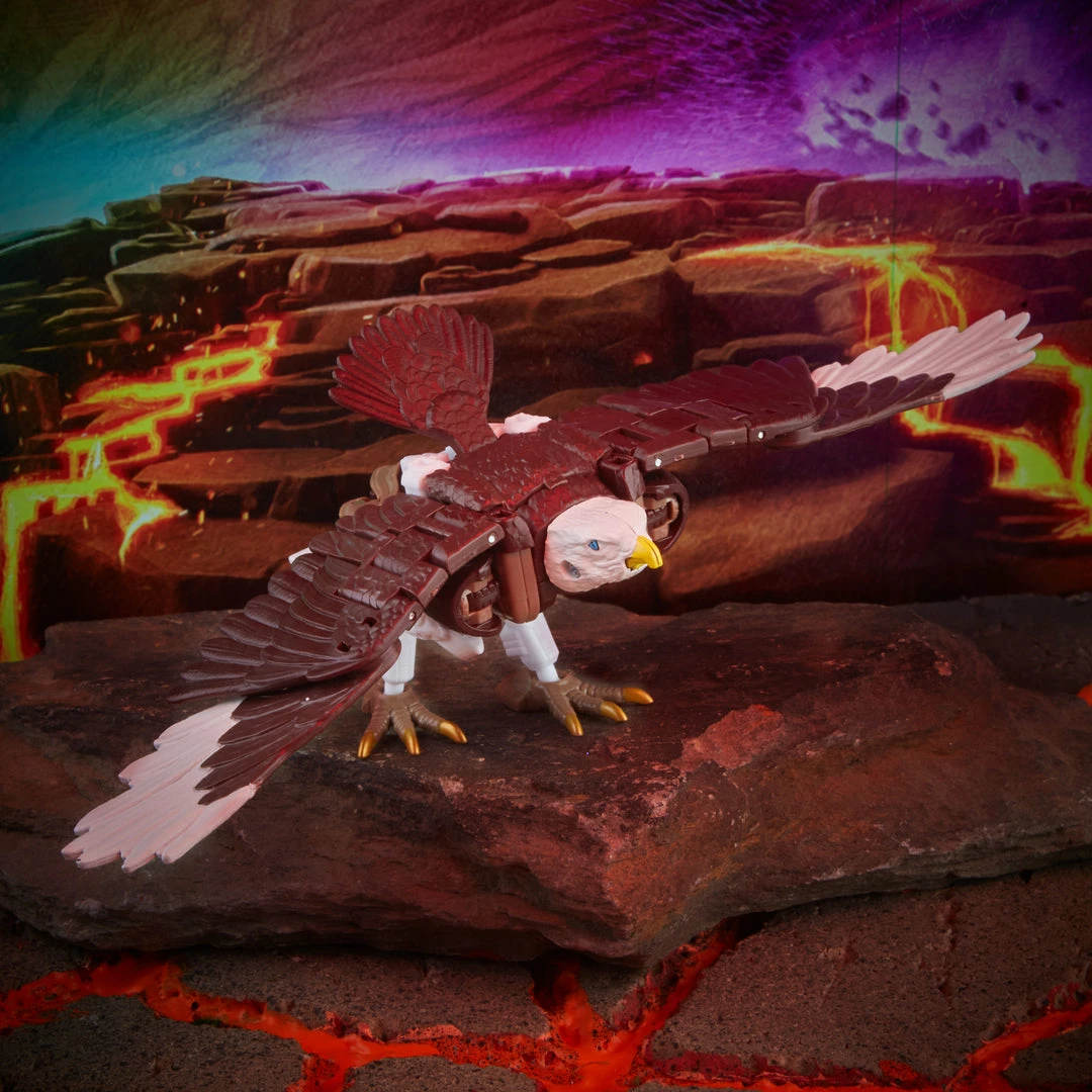 The G1-inspired Sideswipe toy converts to sportscar mode in 16 steps. The Beast-Wars: II-inspired Maximal Skywarp figure converts to bald eagle mode in 22 steps. Comes with a shoulder cannon, blaster, and 2 Photon Blaster accessories.