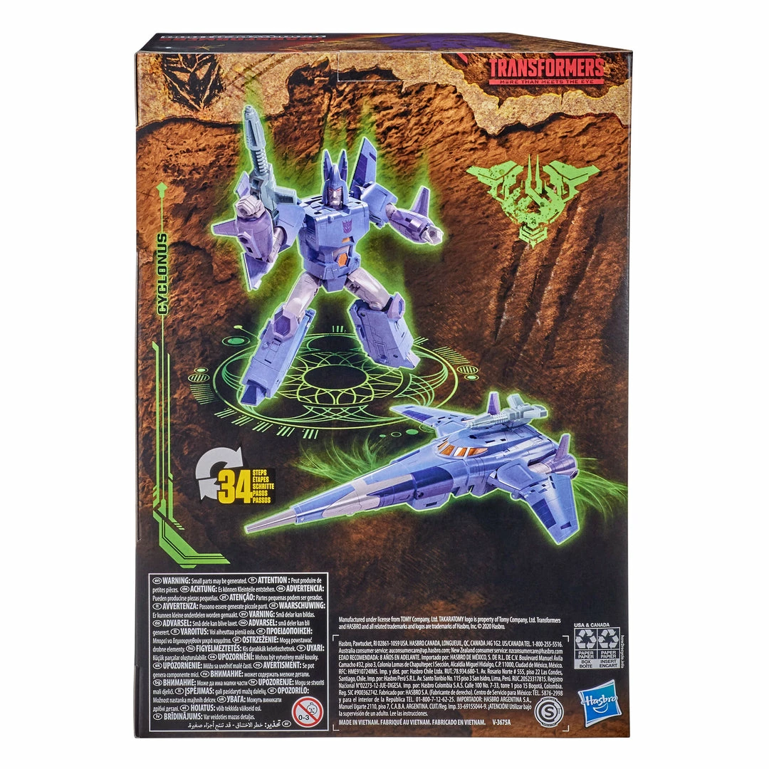 Includes Transformers Generations War for Cybertron: Kingdom Voyager Class Cyclonus figure, accessory, Golden Disk card, and instructions.