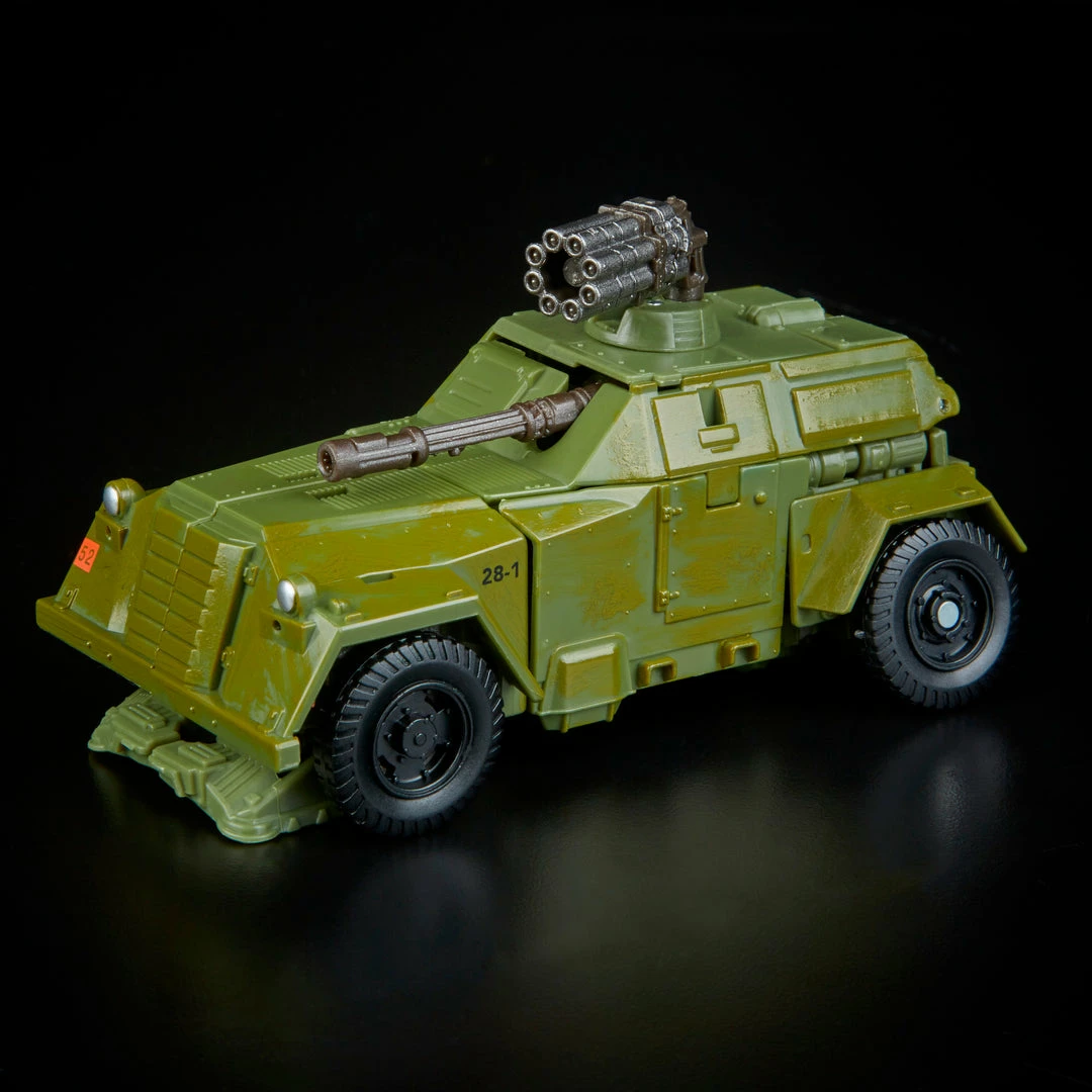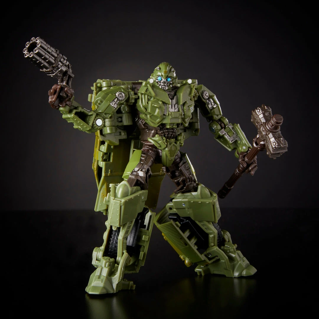 This Studio Series 26 Deluxe Class Transformers: The Last Knight WII Bumblebee figure converts from robot to tank mode in 25 steps. Remove backdrop to showcase WWII Bumblebee in the WWII Flashback scene. Figure features vivid, movie-inspired deco and includes detailed weapon accessories: a blaster and a hammer modeled after the weapons Bumblebee uses in the film.